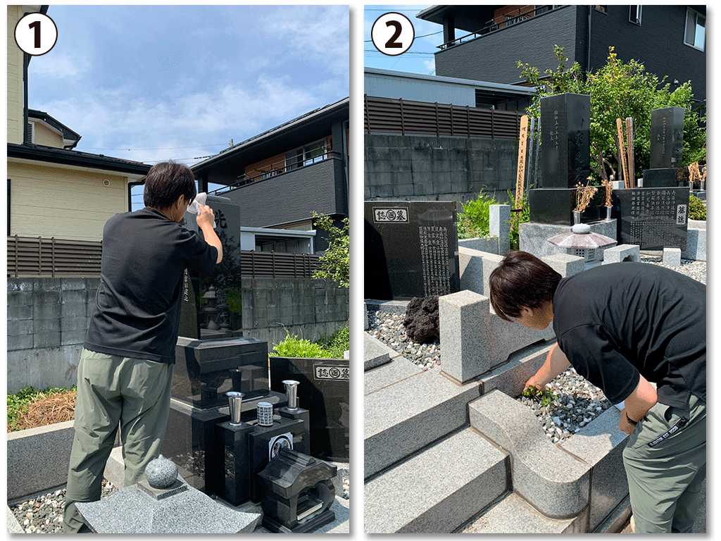高圧洗浄機などでお墓を洗浄して雑草などを抜き取ります。